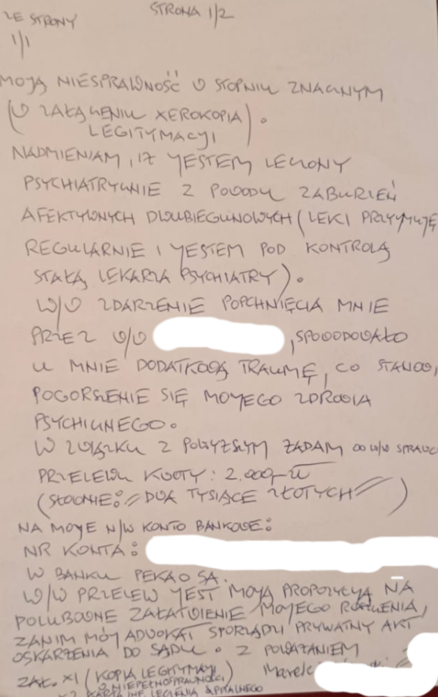 Do naszej redakcji trafiła kopia odręcznego pisma z dokumentu wynika, że jego autor opisuje swoją sytuację, a następnie przechodzi do konkretu: pojawia się żądanie zapłaty 2000 zł wraz z numerem rachunku bankowego. W treści pada również sformułowanie: